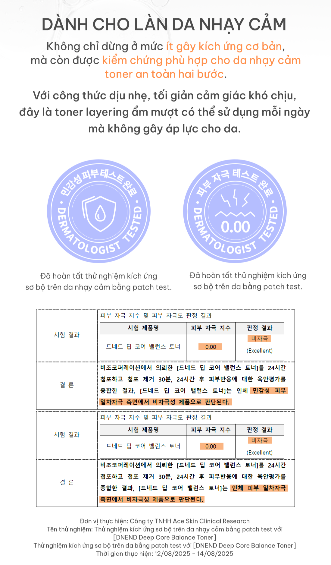 Toner Cân Bằng Lõi Sâu DNEND là giải pháp layering nhiều lớp (1·2·3 lớp) giúp cân bằng, phục hồi và dưỡng ẩm sâu cho làn da. Với công thức Time Craft Formula , kết hợp các công nghệ chiết xuất - lên men - ngâm ủ theo yếu tố thời gian đặc trưng Hàn Quốc , sản phẩm giúp da khỏe từ bên trong, ổn định và rạng rỡ .