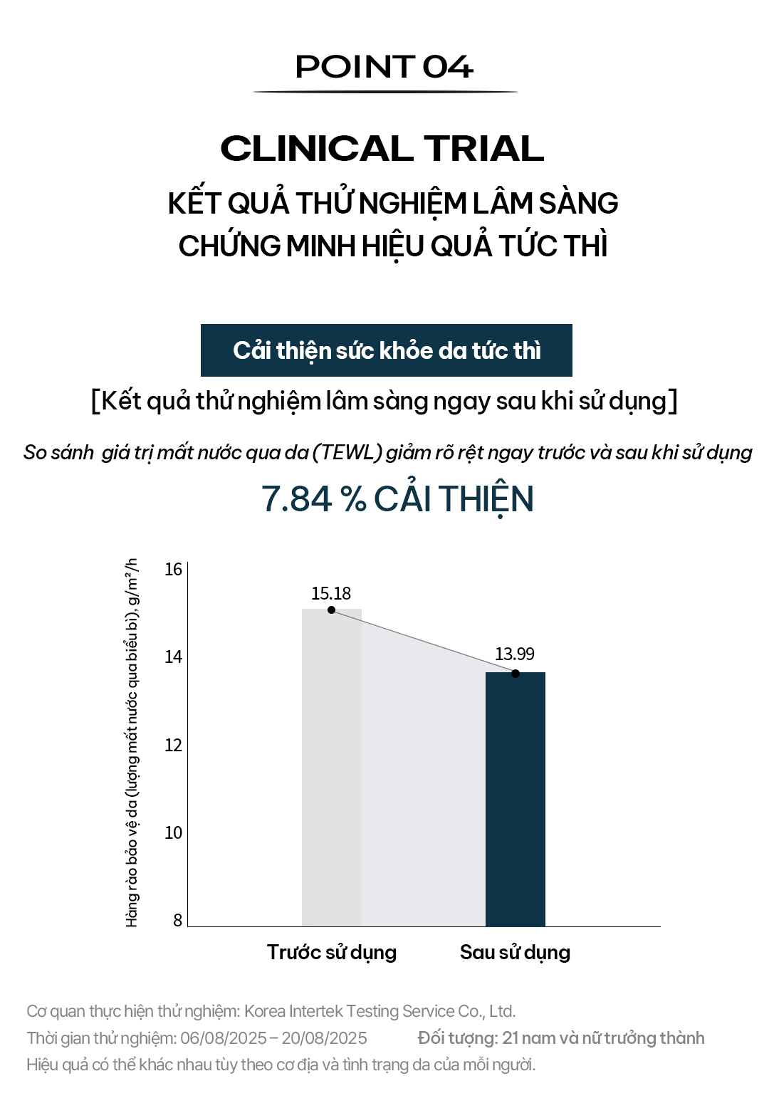 Kết quả kiểm nghiệm lâm sàng (Intertek) ghi nhận mức kích ứng da: 0.00 – hoàn toàn không gây kích ứng.