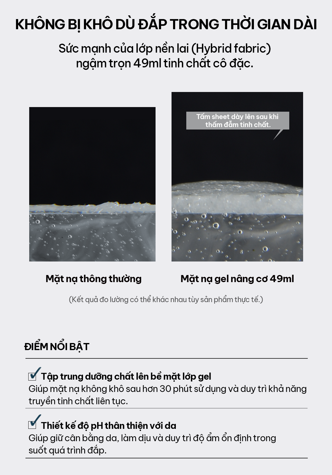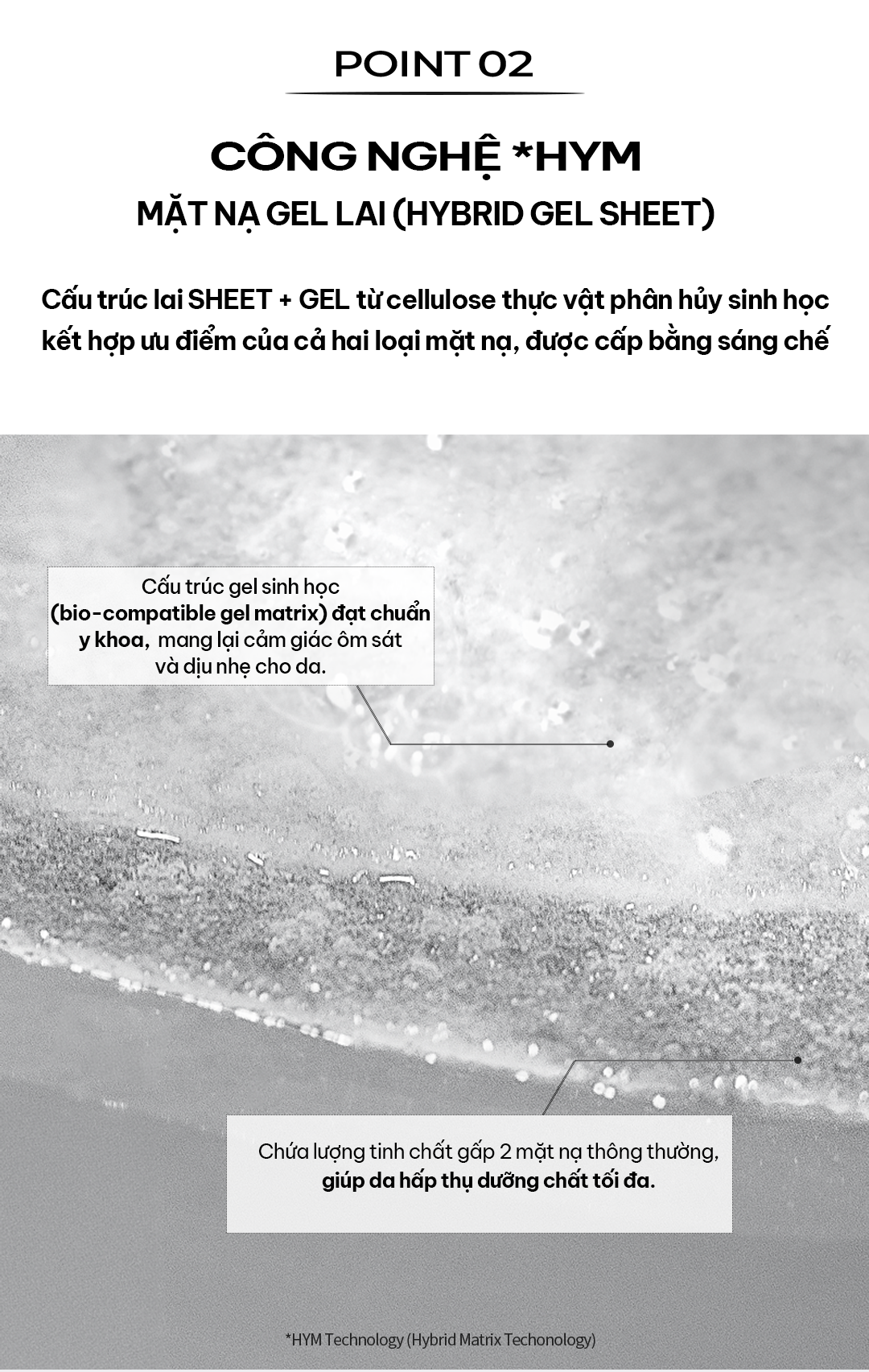 Công nghệ HYM Technology™ - Mặt nạ lai sheet + gel sinh học: Giữ lượng tinh chất gấp 2 lần so với mask thông thường, bám khít da, không khô suốt 30 phút sử dụng.