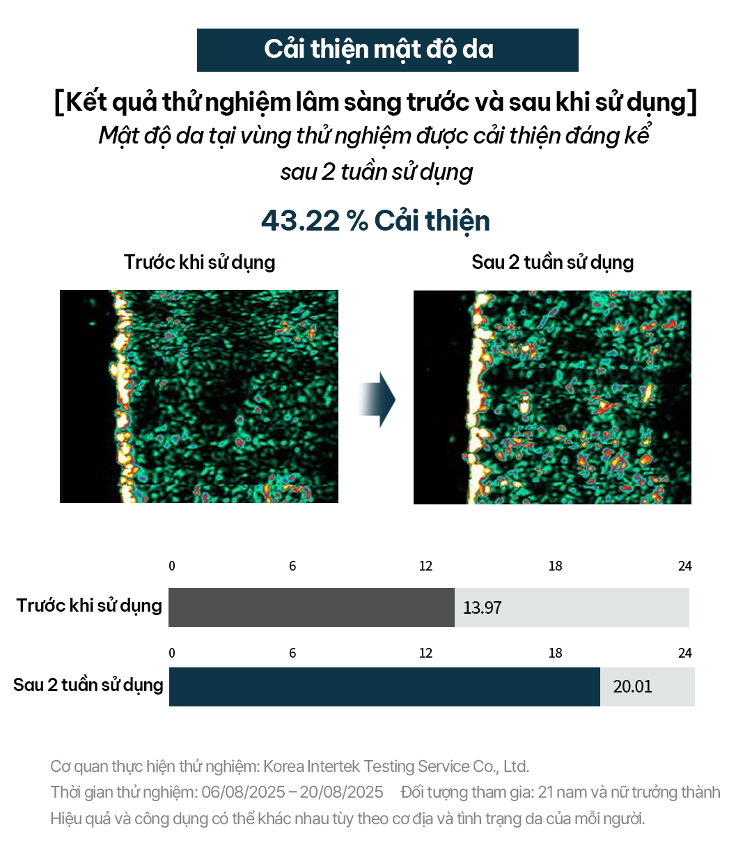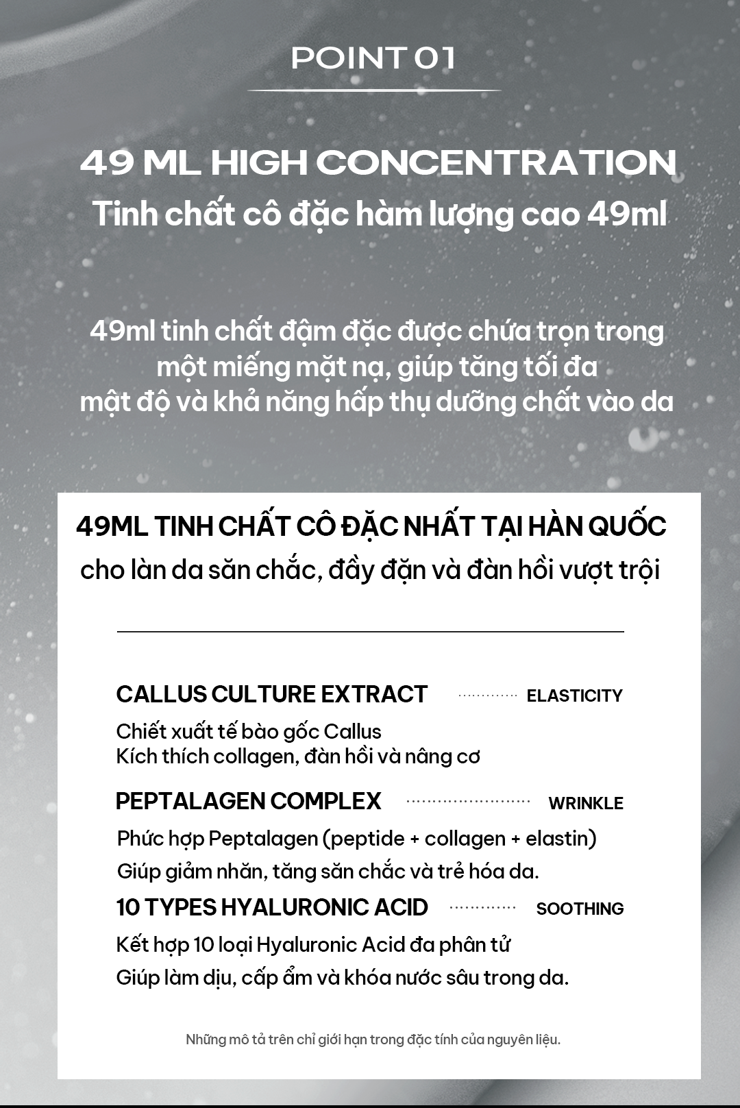 Phức hợp Callus Culture Extract + Peptalagen Complex: Kích thích sản sinh collagen & elastin, tăng độ đàn hồi, cải thiện độ săn chắc da, giảm nếp nhăn hiệu quả.