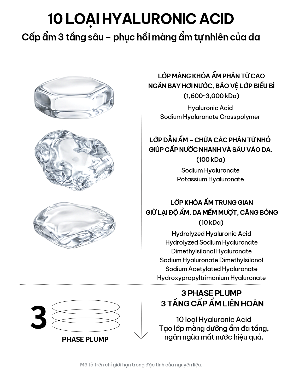 10 loại Hyaluronic Acid: Cấp ẩm 3 tầng sâu – khóa nước, dẫn ẩm, giữ ẩm – mang lại làn da căng bóng, mịn màng và ẩm mượt.
