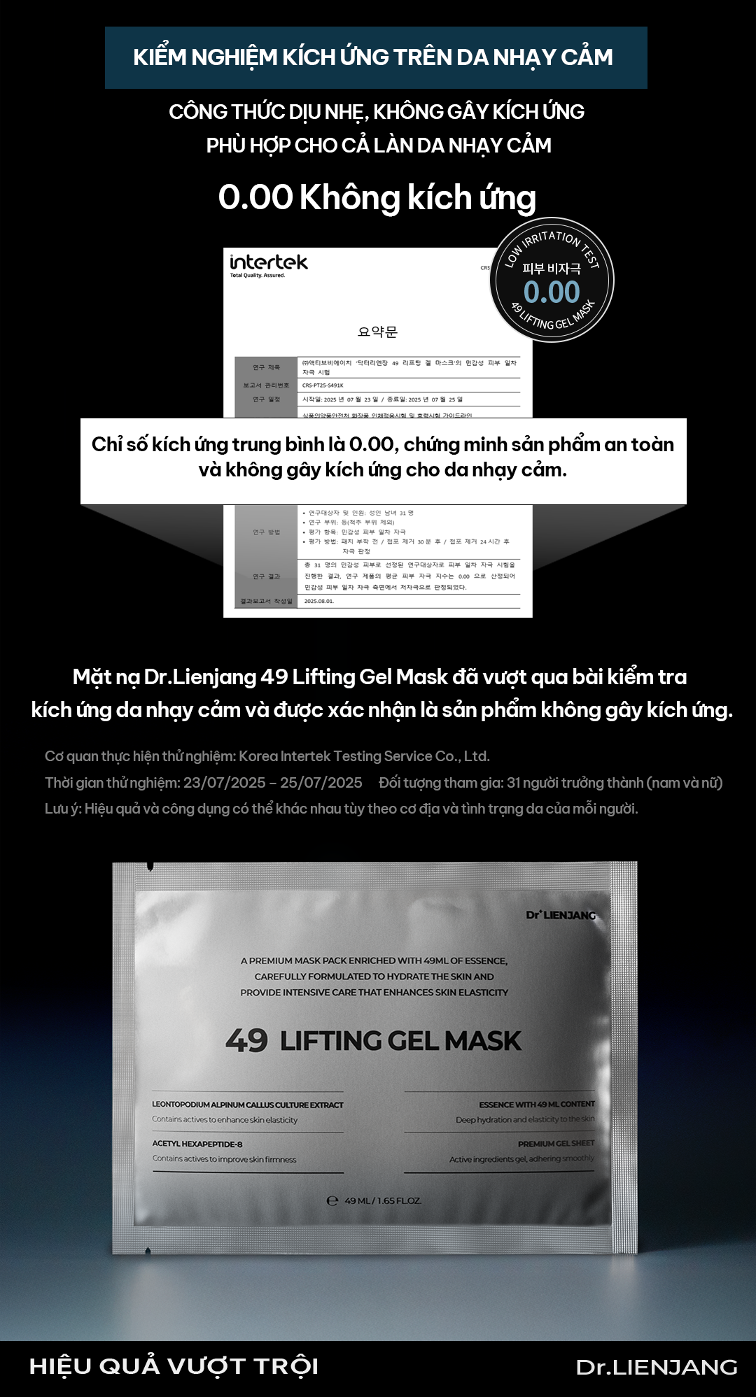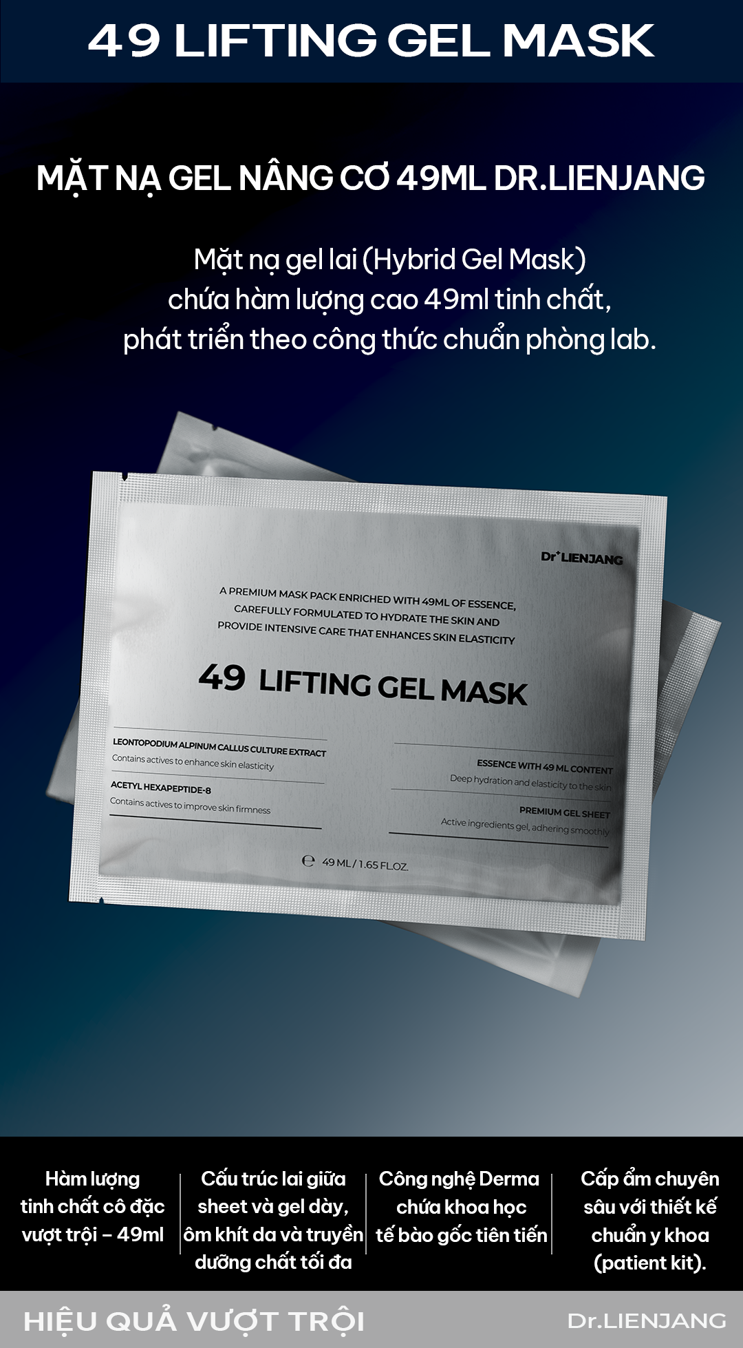 Dr.Lienjang 49 Lifting Gel Mask là mặt nạ gel lai (Hybrid Gel Mask) chứa 49ml tinh chất cô đặc – gấp đôi lượng dưỡng so với mặt nạ thông thường. Sản phẩm được nghiên cứu và phát triển theo công thức chuẩn phòng lab , giúp nâng cơ, phục hồi và tăng độ đàn hồi vượt trội cho da.