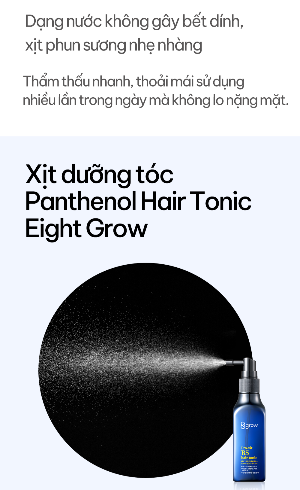 Xịt Dưỡng Tóc Eightgrow Pro-Vit B5 là giải pháp chăm sóc tóc chuyên sâu đến từ Hàn Quốc, giúp cải thiện tình trạng rụng tóc từ gốc – bằng cách nuôi dưỡng da đầu, làm dịu và bảo vệ sợi tóc. Sản phẩm sử dụng công nghệ độc quyền cùng các thành phần thực vật tự nhiên, mang đến một liệu trình "one-step" tiện lợi và hiệu quả.