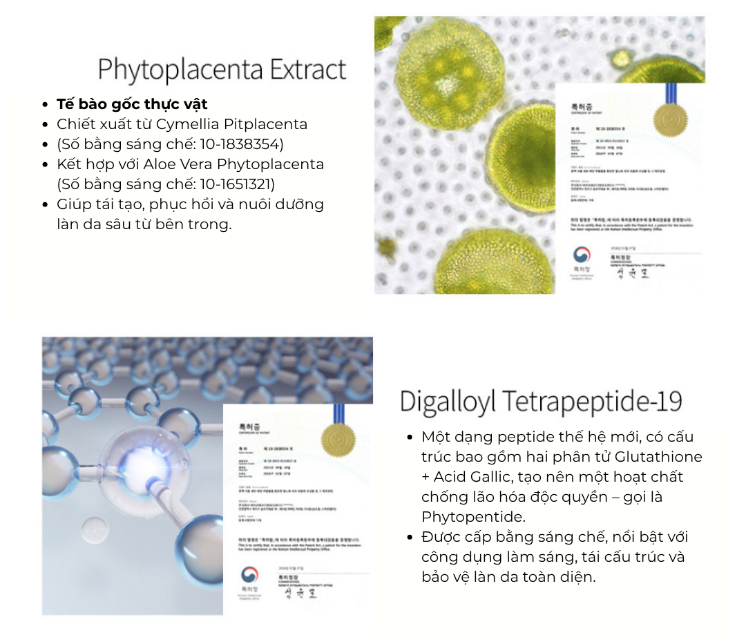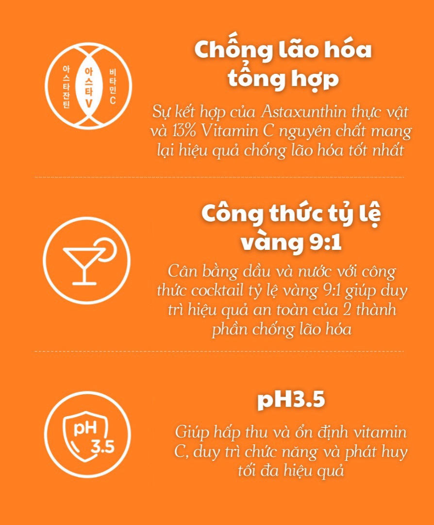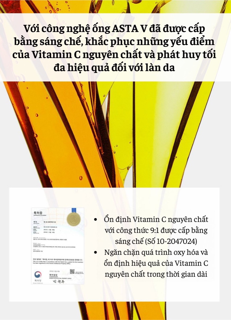 được cấp bằng sáng chế, tối ưu hóa hiệu quả chống lão hóa. Vì vitamin C nguyên chất là thành phần ưa nước nên khi kết hợp với thành phần Astaxanthin chứa nước tinh khiết sẽ giúp tăng cường khả năng hấp thụ và dưỡng da.