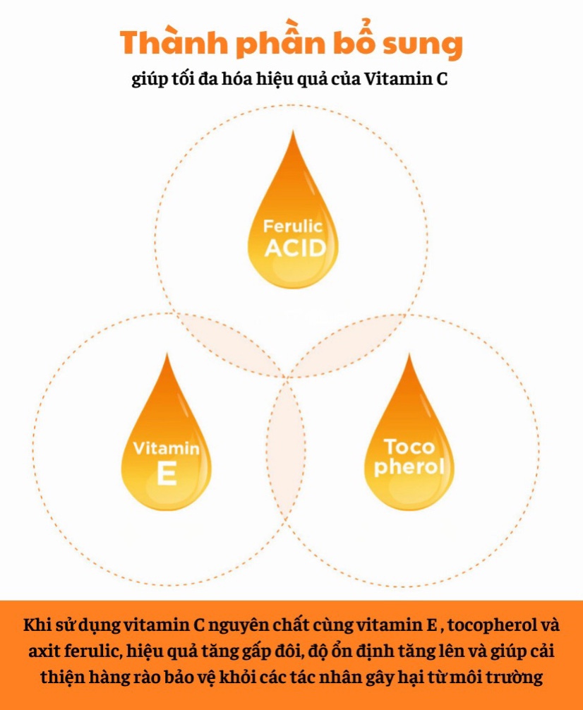 : Ferulic Acid + Vitamin E + Tocopherol giúp hiệu quả tăng gấp đôi, tăng độ ổn định và giúp cải thiện hàng rào bảo vệ khỏi các tác nhân gây hại từ môi trường