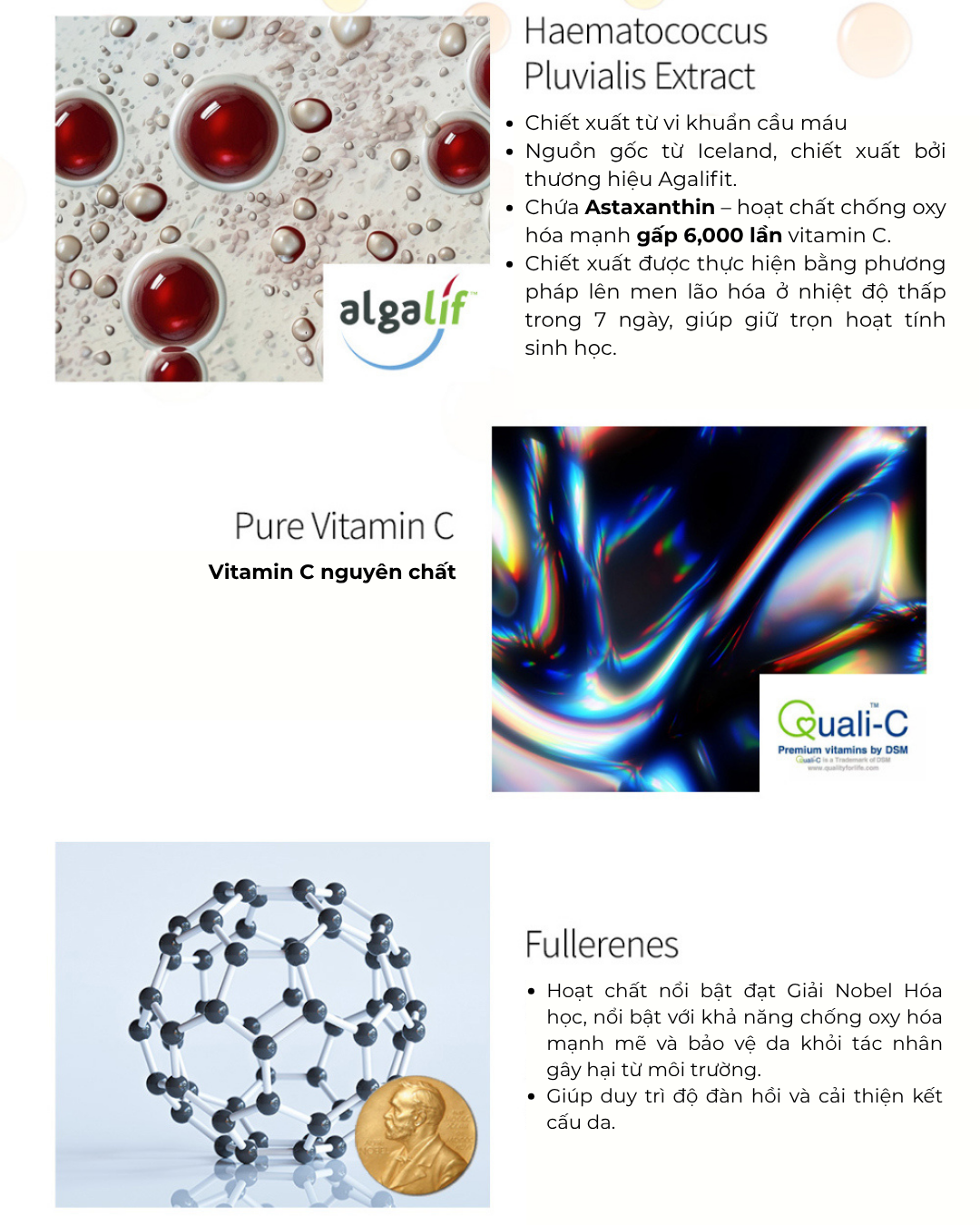 - Vitamin C nguyên chất từ DSM (Anh Quốc) - nhà cung cấp vitamin hàng đầu thế giới; Astaxanthin từ Haematococcus pluvialis - vi tảo quý hiếm.