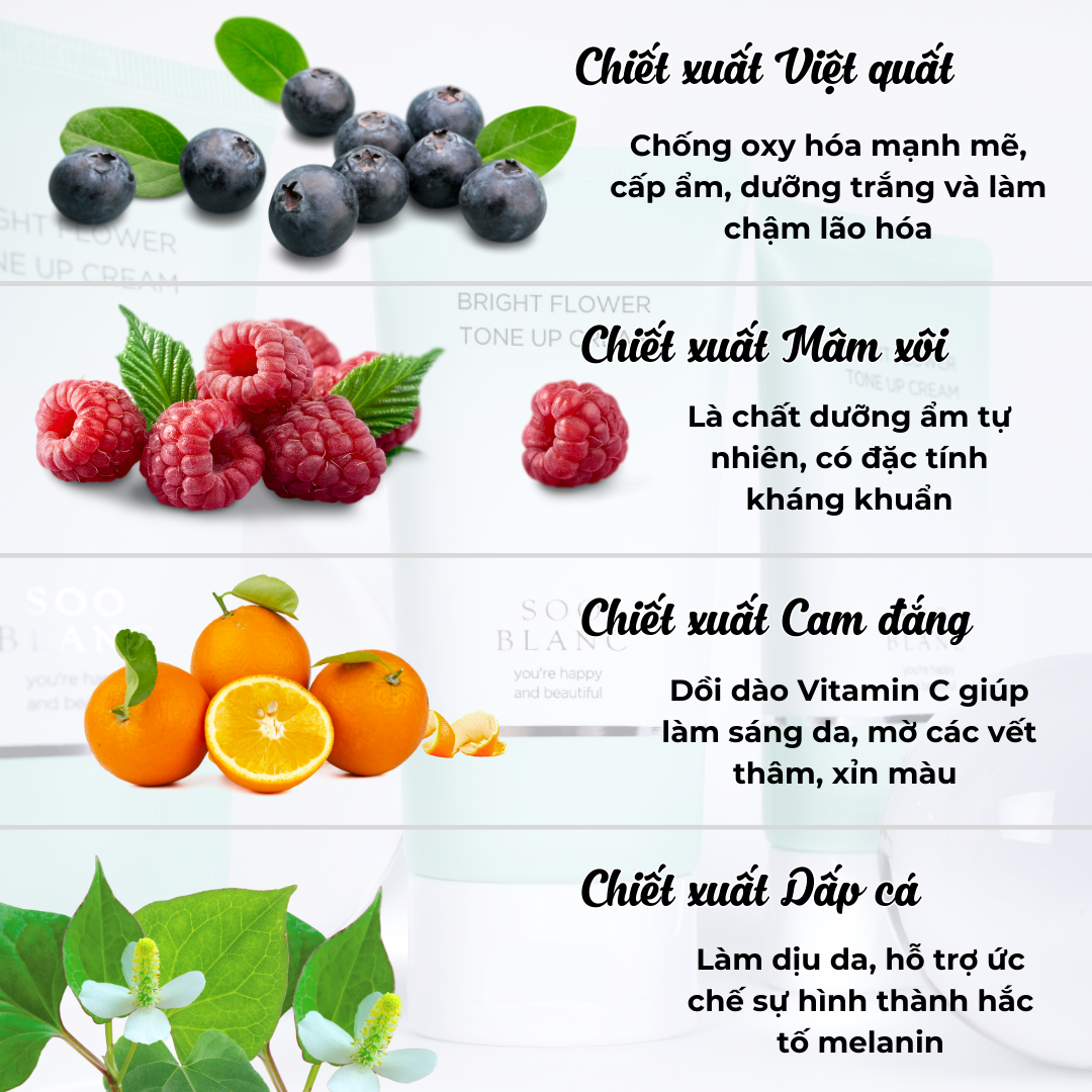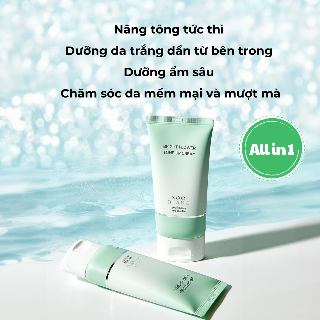 Soo Blanc Bright Flower Tone Up Cream là sản phẩm chăm sóc da đa năng, hội tụ đầy đủ những ưu điểm nổi trội từ thành phần, công dụng đến mùi hương, giúp bạn sở hữu làn da trắng sáng, mịn màng và căng tràn sức sống